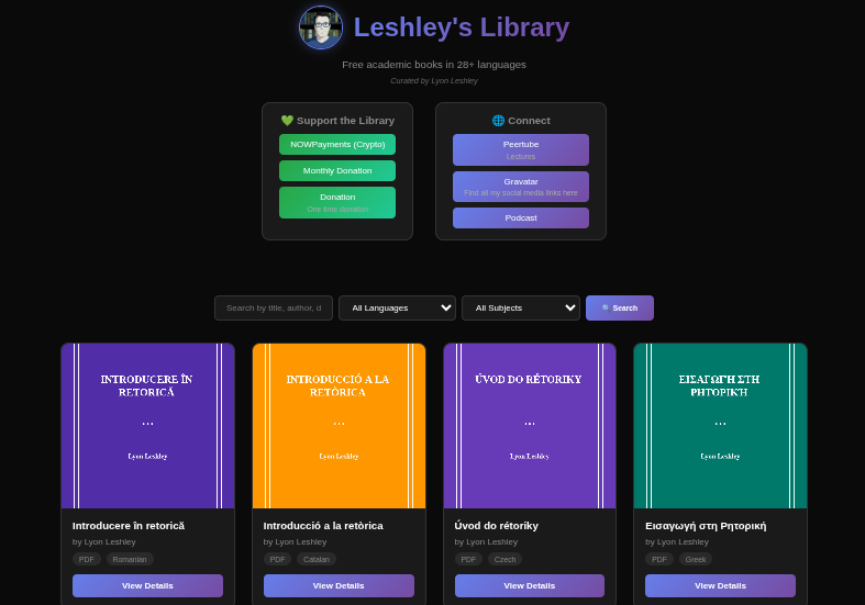 Leshley’s Library (https://library.leshley.ca/) is an open‑access hub that delivers scholarly lectures and public‑domain works to anyone, anywhere, completely free and without paywalls.
